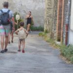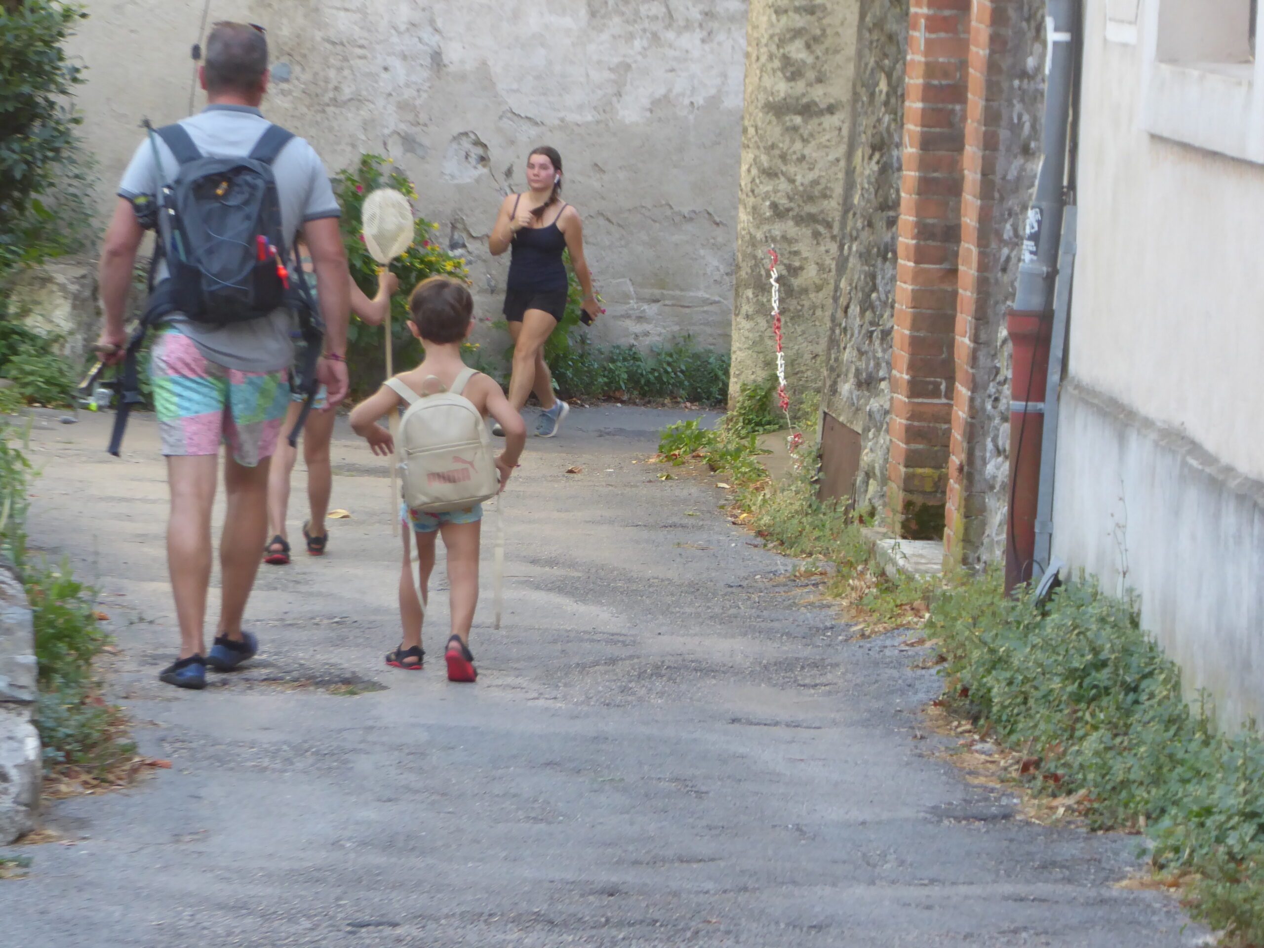 Voici un pêcheur muni d’un lancer, précédé de son fils muni d’une petite épuisette pour attraper des petits poissons…